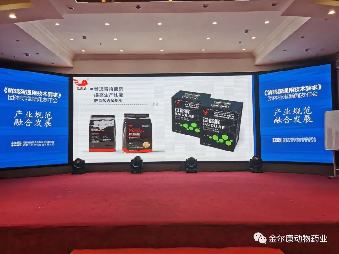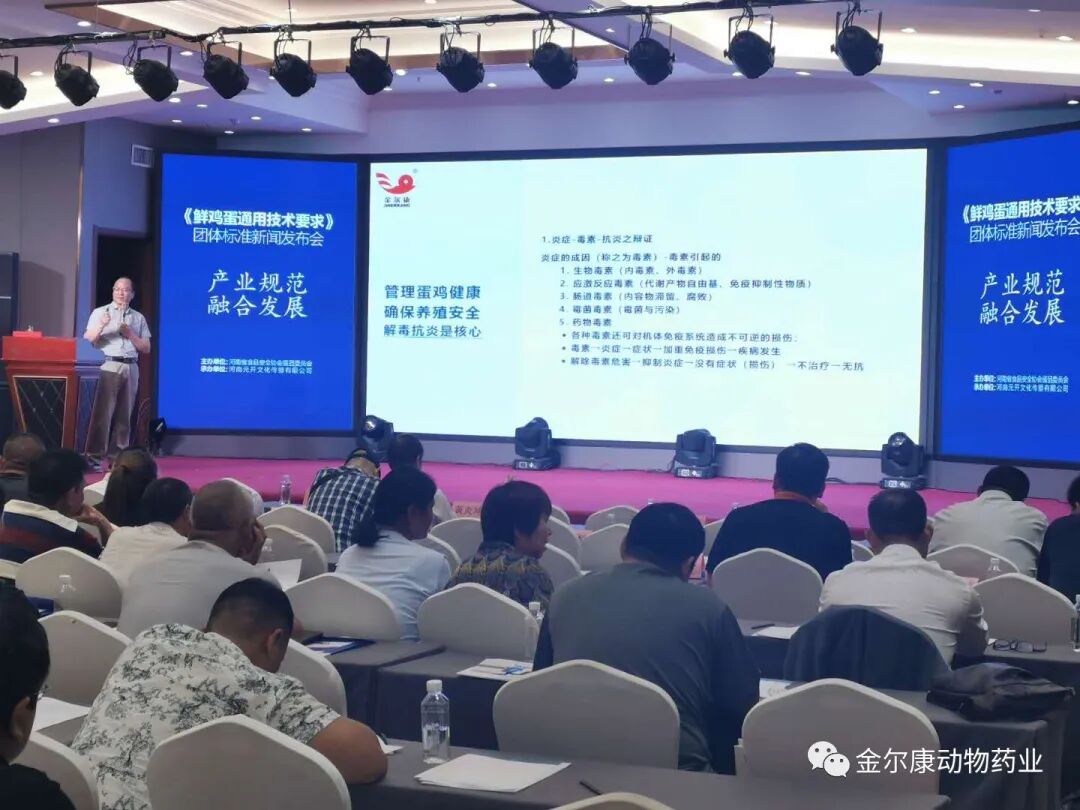 河南省食品安全协会齐天生会长、韩俊岭主任致辞讲话,河南牧业经济学院动物科技学院韩占兵教授解读团体标准对保障蛋品安全,推进整体食品安全工作的指导意义。 之后   作为《鲜鸡蛋通用技术要求》的起草单位和起草人之一,深感荣幸和责任。金尔康生物科技有限公司历经15年发展历程,是行业内第一家先成立研发中心后组建生产基地的企业。15年来坚持以“技术驱动”促发展,四千多万的研发硬件投入和豪华的研发团队配套,在行业内做出了一点成绩,贡献了一份力量。   金尔康开创性的提出“毒素理论”、“动物发病机理”、“蛋鸡围产期高产方案”,努力践行“用科技改善和提升动物健康”企业使命,坚持“确保动物健康、提高动物生产性能及确保动物出栏前的食品安全”为研发方向,通过理论突破到科研创新再到形成熟方案。作为起草单位及起草人,我们将一如既往用科技的投入来实现无抗、有效、高产,从生产端、从管理动物自身健康做起推进落实《鲜鸡蛋通用技术》团标落地。           金尔康集团产品研发中心主任、河南牧业经济学院崔耀明教授做 《管理动物健康&提高生产性能》专题报告。崔教授表示,研发团队一直坚持“确保动物健康、提高生产性能、保证动物出栏前的食品安全”三大研发方向,确保动物健康的关键就是“解除毒素危害”。       机体毒素超载导致营养不能充分利用而“减效”,解除毒素危害实现无抗的同时加强营养代谢,提高生产性能。   针对抗炎抗病是机体营养“耗能大户”这个养殖难题,崔老师也给出来了解决方案:         蛋品企业高质量发展,标准是基石。金尔康集团作为河南省食品安全协会质量规范专业委员会主任单位,组织参与起草的《鲜鸡蛋通用技术要求》团体标准,推动了国内蛋鸡产业规模化经营的标准化进程,同时也奠定了金尔康集团蛋鸡领域的行业地位;该团体标准发布实施,为蛋品行业高质量发展做出应有贡献。   金尔康集团工程技术研究中心三大研发方向: